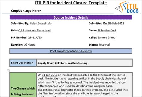 Itil Change Management Post Implementation Review Template